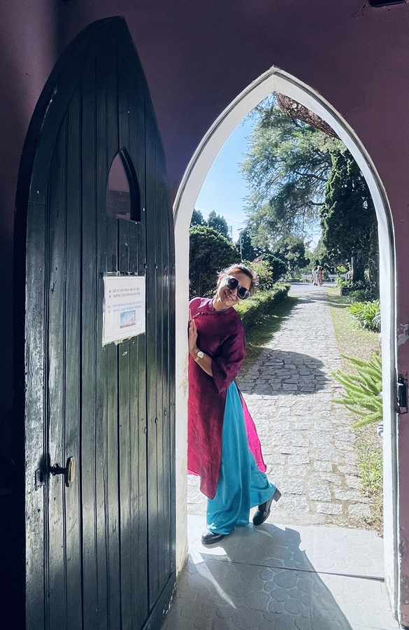 Giữa vòm cửa cao vút, bóng dáng ấy trở nên nhỏ bé nhưng đầy sức sống, như một điểm chạm rực rỡ giữa bức tranh kiến trúc cổ kính. Ở đây, tiếng chuông nhà thờ có lẽ đã ngưng từ lâu, chỉ còn tiếng gió thì thầm qua kẽ lá và tiếng lòng người phụ nữ đang hòa nhịp cùng cao nguyên.