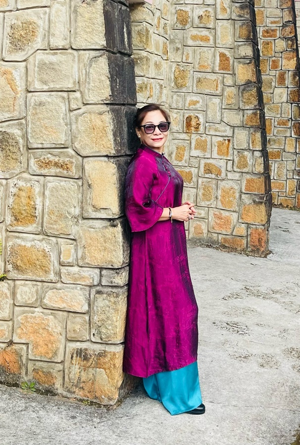 Tà áo dài màu tím thẫm, tựa như sắc hoa sim ngan ngát trên sườn đồi, khẽ khàng lướt qua những vòm cửa hình cung mang dấu ấn của thời gian. Mỗi bước chân chị đi, mỗi dáng ngồi chị tựa, dường như đều đang đối thoại với những bức tường đá rêu phong và những hành lang vắng lặng. Ánh nắng buổi sớm ở đây không gắt gỏng; nó xuyên qua những kẽ lá, rọi xuống lối đi rải sỏi, tạo thành những vệt sáng tối đan xen như những phím đàn piano khổng lồ đang đợi người nghệ sĩ dạo lên bản nhạc của sự bình yên.